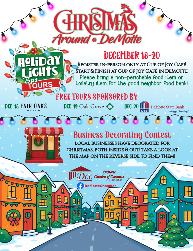 The DeMotte Chamber of Commerce is partnering with Cup of Joy Cafe to bring Holiday bus tours to DeMotte. There will be three evenings to choose from. Bring your family, friends and coworkers and load the bus to tour Christmas lights around DeMotte.